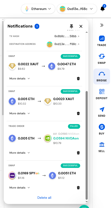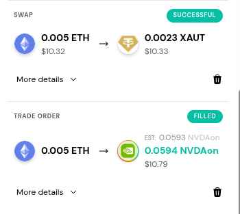 Swapping/bridging and trading are different, as a swap or bridge is between crypto and will show a ‘Successful’ status when completed. A trade is trading for stocks and will show a ‘Filled’ status when it is completed.