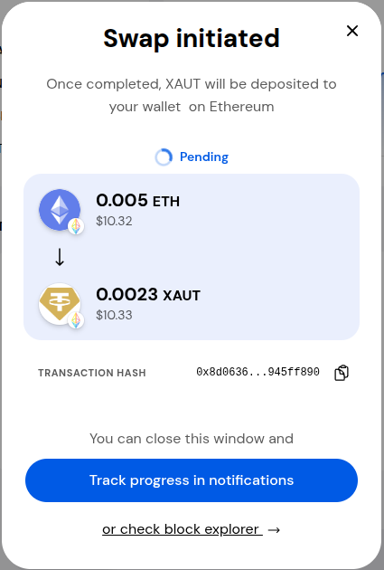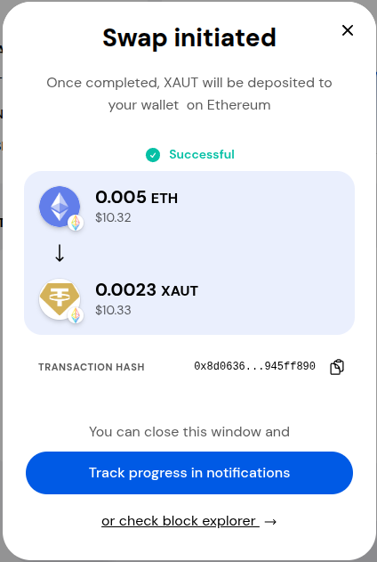 There will be a pop up stating your swap is initiated. Once the transaction is confirmed on the blockchain, the pop up will state your swap was successful.
