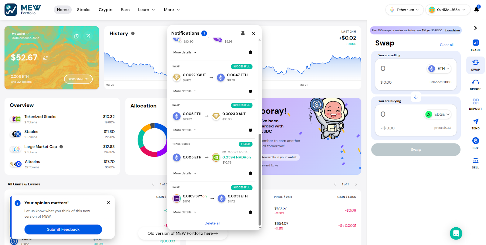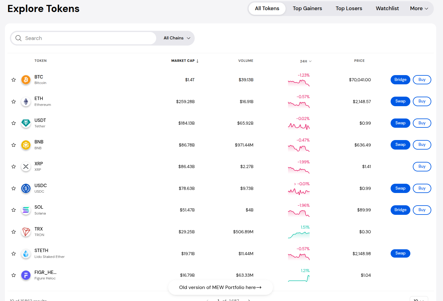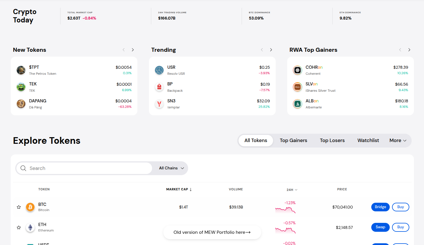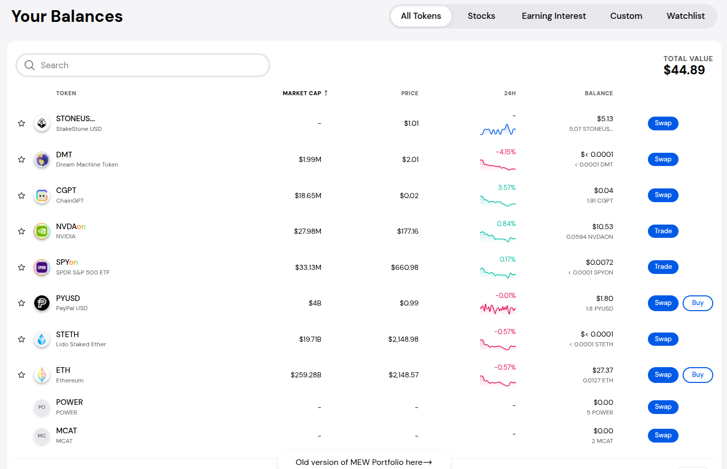 Tokenized stocks are MEW Portfolio’s newest exciting addition, but buying, managing, and swapping crypto is as easy as ever. Discover new and trending tokens on the Crypto page.