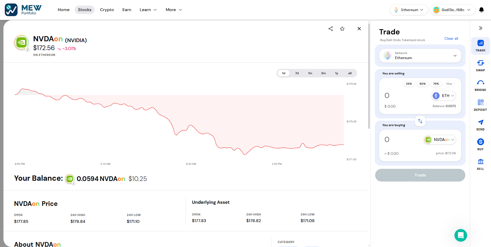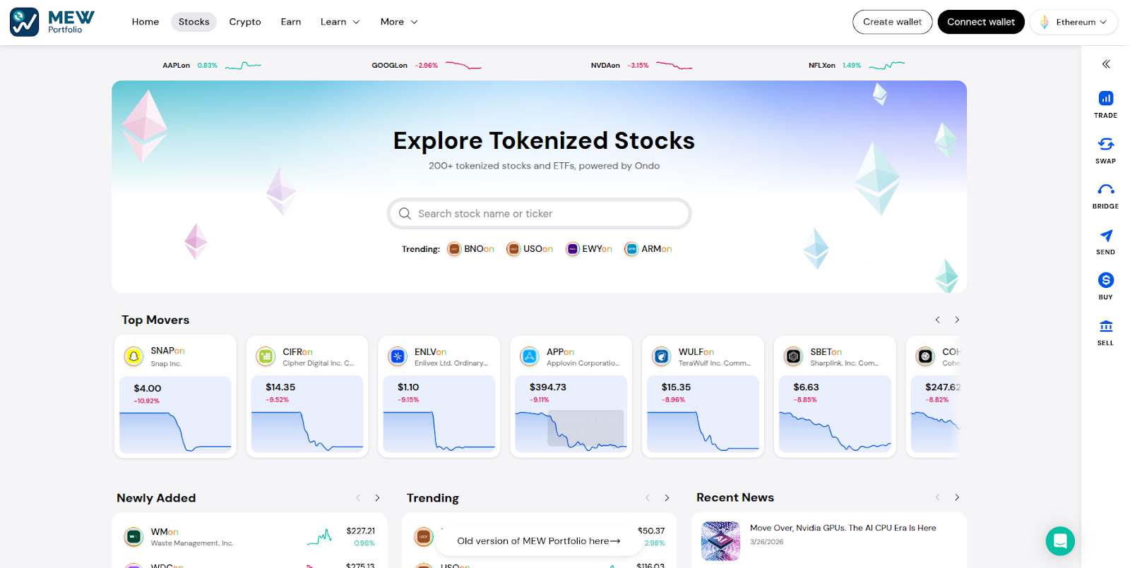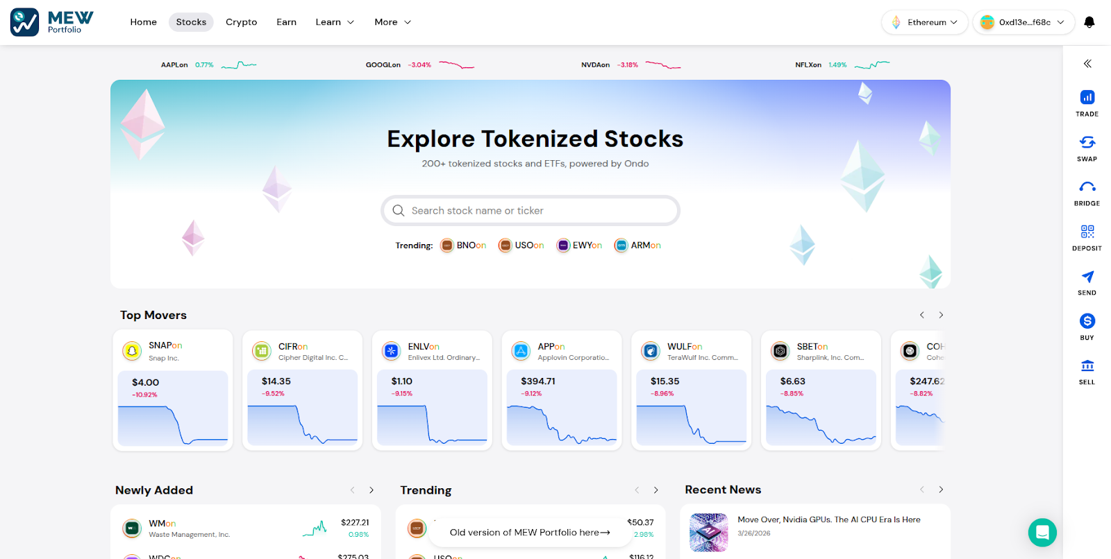 With MEW Portfolio, you can access tokenized stocks directly from your existing crypto wallet—no new accounts, no switching platforms. Just connect your wallet and get started.