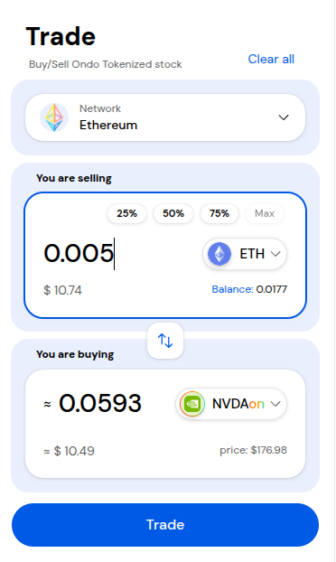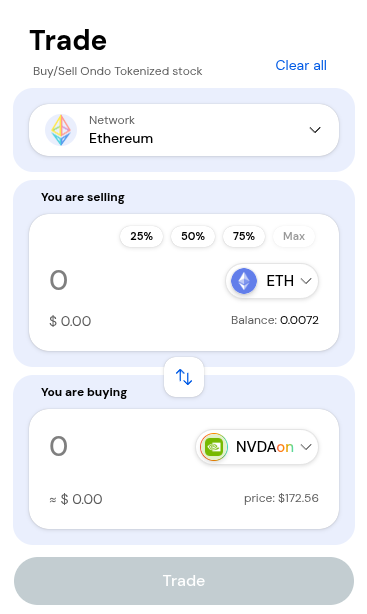 Select the token dropdown menu to select the token you want to use to trade for the tokenized stock.