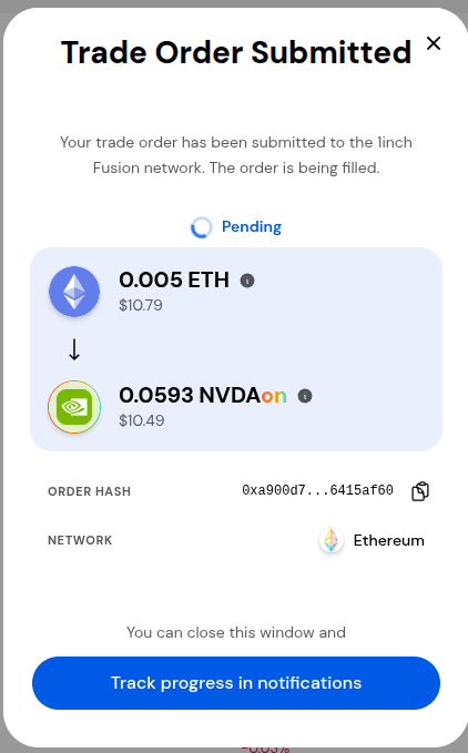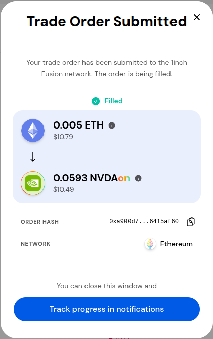 The Trade order will be submitted. Once the trade is complete the pop up will say the order was filled. This may take a few minutes depending on network traffic.