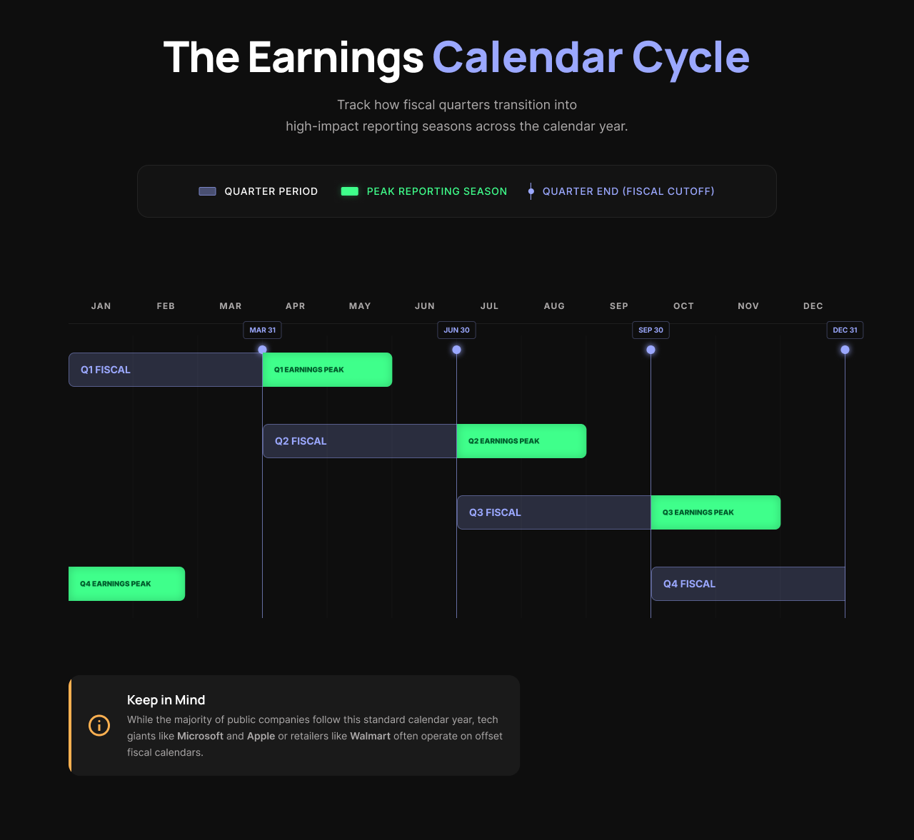 - Not all companies follow the same fiscal year. Apple's fiscal year, for instance, ends in September, so its quarters are offset from the standard calendar. Always check a company's specific reporting schedule. You can usually find this on the Investor Relations page, more on that below.