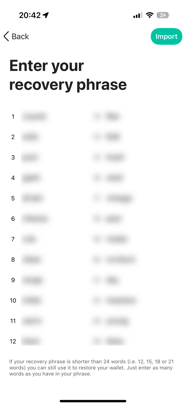 Enter your recovery phrase then click ‘Import’ at the top right.