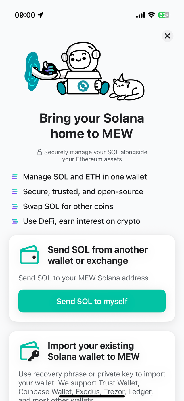Back on the MEW Mobile app, you'll see these new options when you click on ‘Try Solana on MEW’ from the wallet home screen or switch to the Solana network in the top left corner. Select ‘Move your SOL to MEW’.