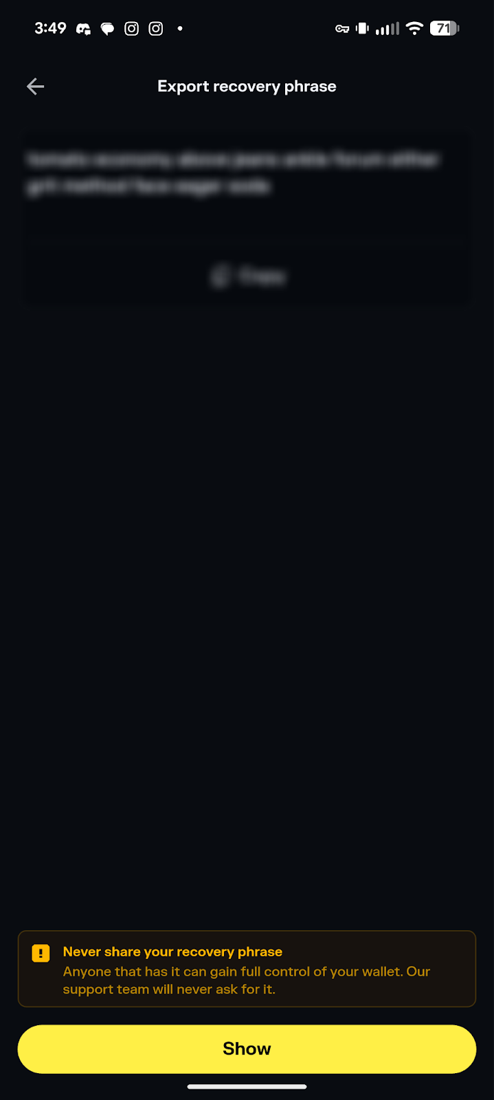 Once you click ‘Show’, your secret phrase will appear for anyone to see! Make sure you're alone and that no one can see your phone screen.
