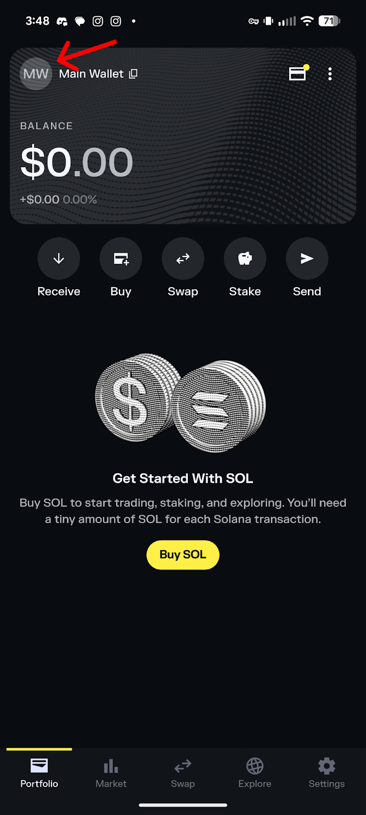On the MEW Mobile app, switch to the Solana network in the top left corner then click on ‘Move your SOL to MEW’.