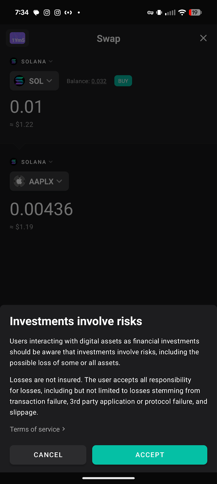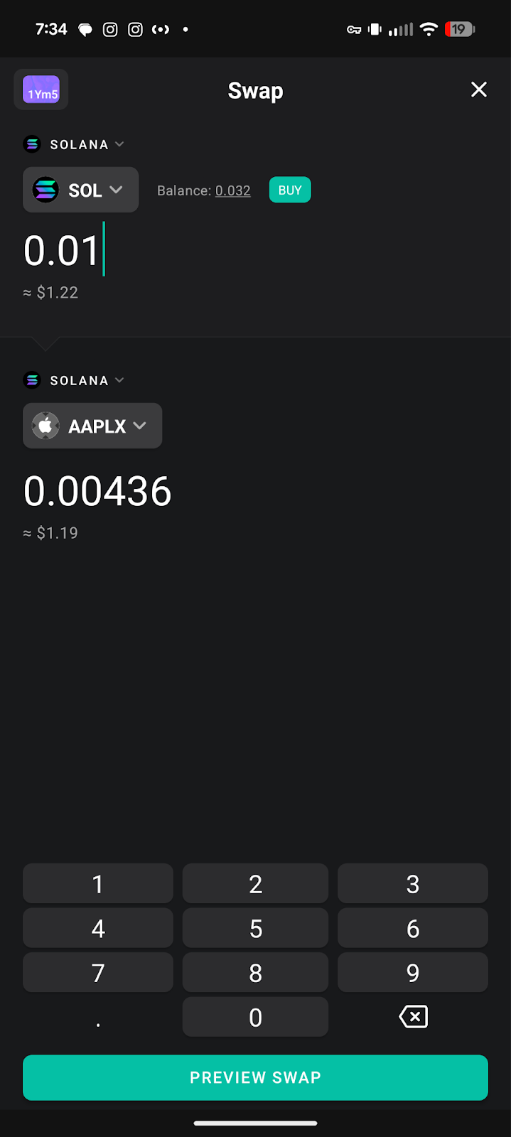 Select the token you want to receive. We will choose the Tokenized AAPL stock (AAPLx).