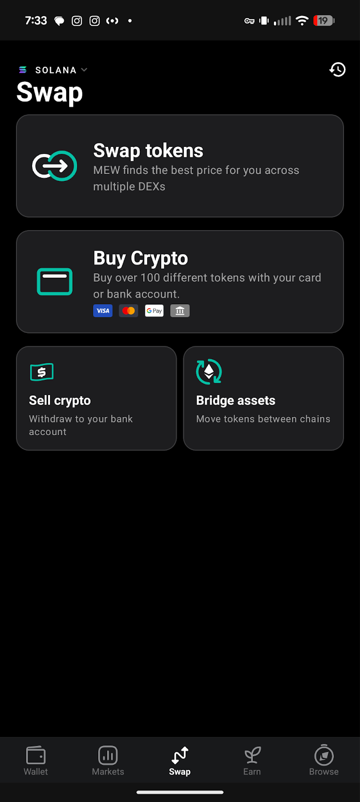 First, unlock your MEW Mobile wallet and make sure you are on the Solana network at the top left then click ‘Swap’ on the navigation bar at the bottom.
