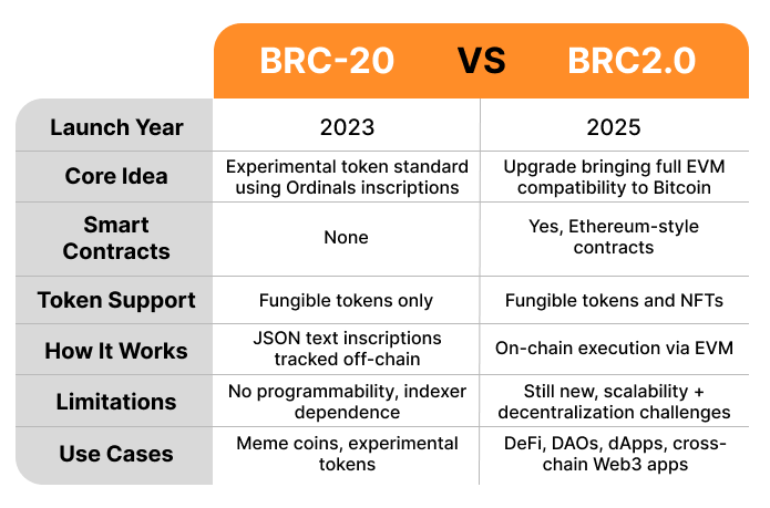 In 2025, the community introduced BRC2.0, a major upgrade that goes beyond simple token issuance. Unlike BRC-20, BRC2.0 is designed to bring Ethereum Virtual Machine (EVM) compatibility to Bitcoin. The pseudonymous creator of BRC-20, Domo, and the Ordinals Infrastructure firm Best in Slot collaborated to create the BRC2.0 upgrade.