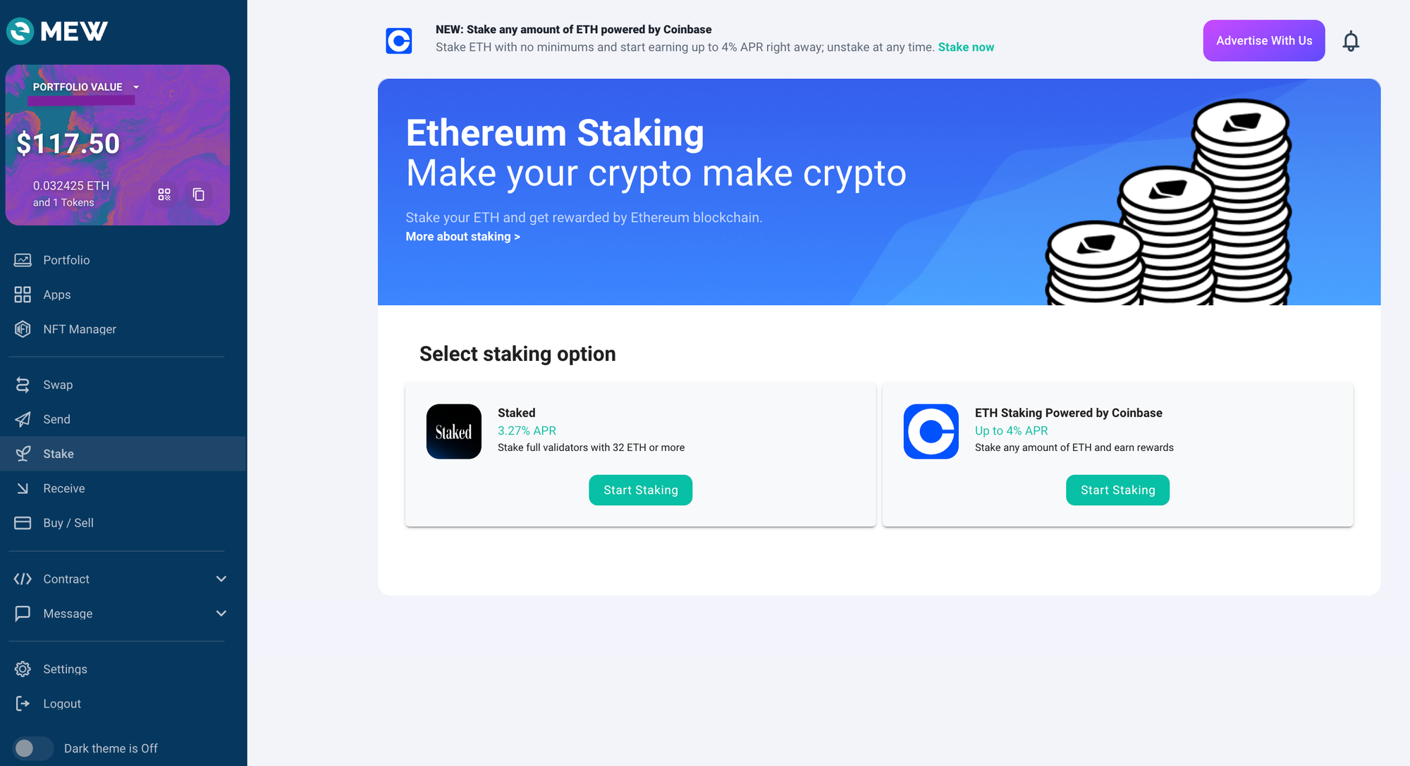 3. On the MEW Portfolio dashboard, go to the Stake page and select the app that works for you: The Staked app for 32 ETH and more, or partial staking powered by Coinbase for no-minimum staking.