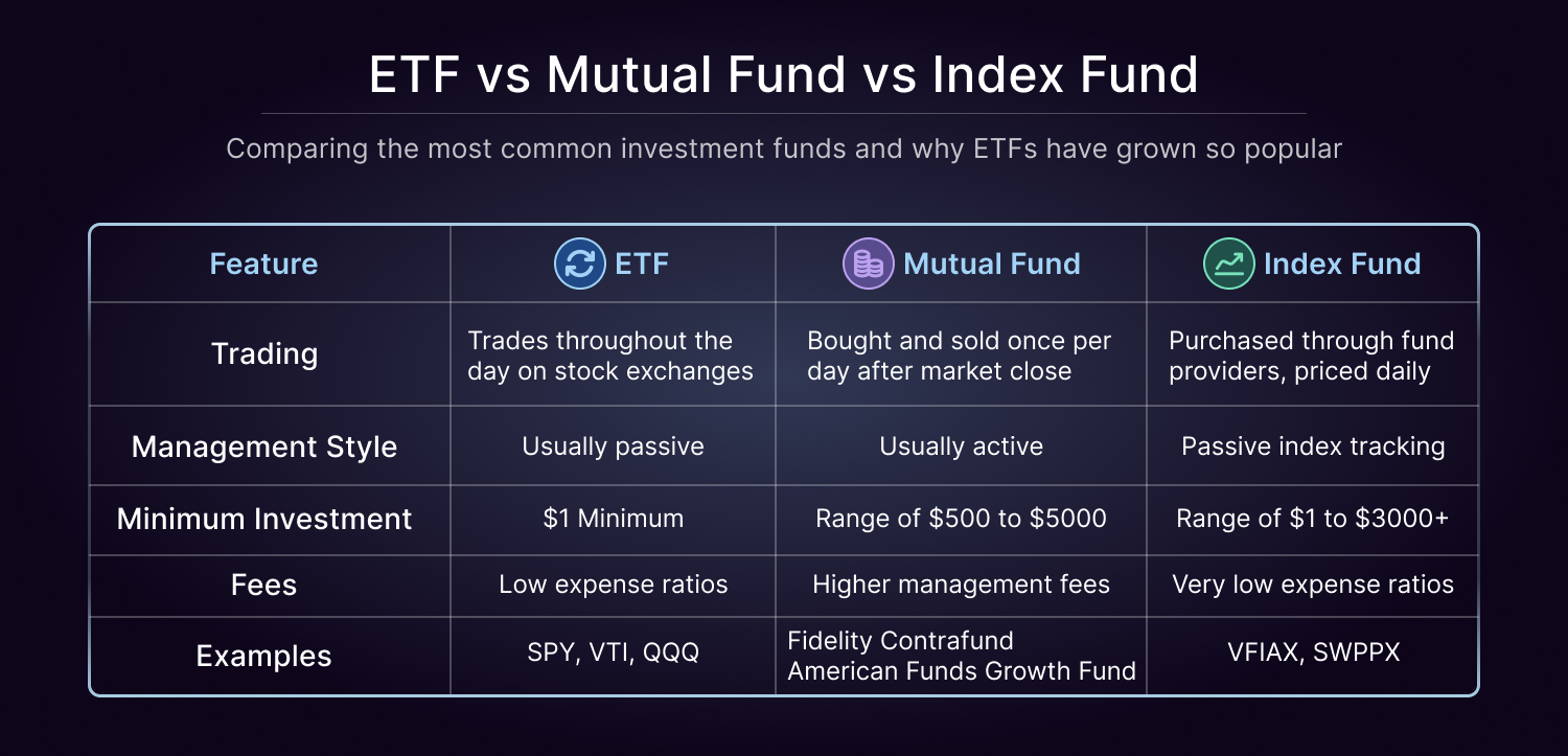 ETFs are often compared with index funds and mutual funds because all three pool money from investors to buy a diversified set of assets. The key differences largely come from how they are traded and managed.