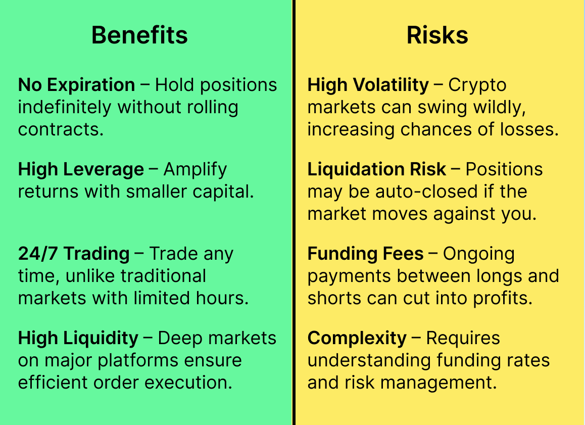 One key benefit of perpetual futures is that positions have no expiration, allowing traders to maintain exposure indefinitely without needing to roll over contracts. They also provide access to high leverage, enabling the amplification of potential returns. Since cryptocurrency markets operate 24/7, traders can react to market events at any time, unlike traditional markets with limited trading hours. Additionally, major perpetual futures platforms offer high liquidity, ensuring efficient execution of trades even for large positions.