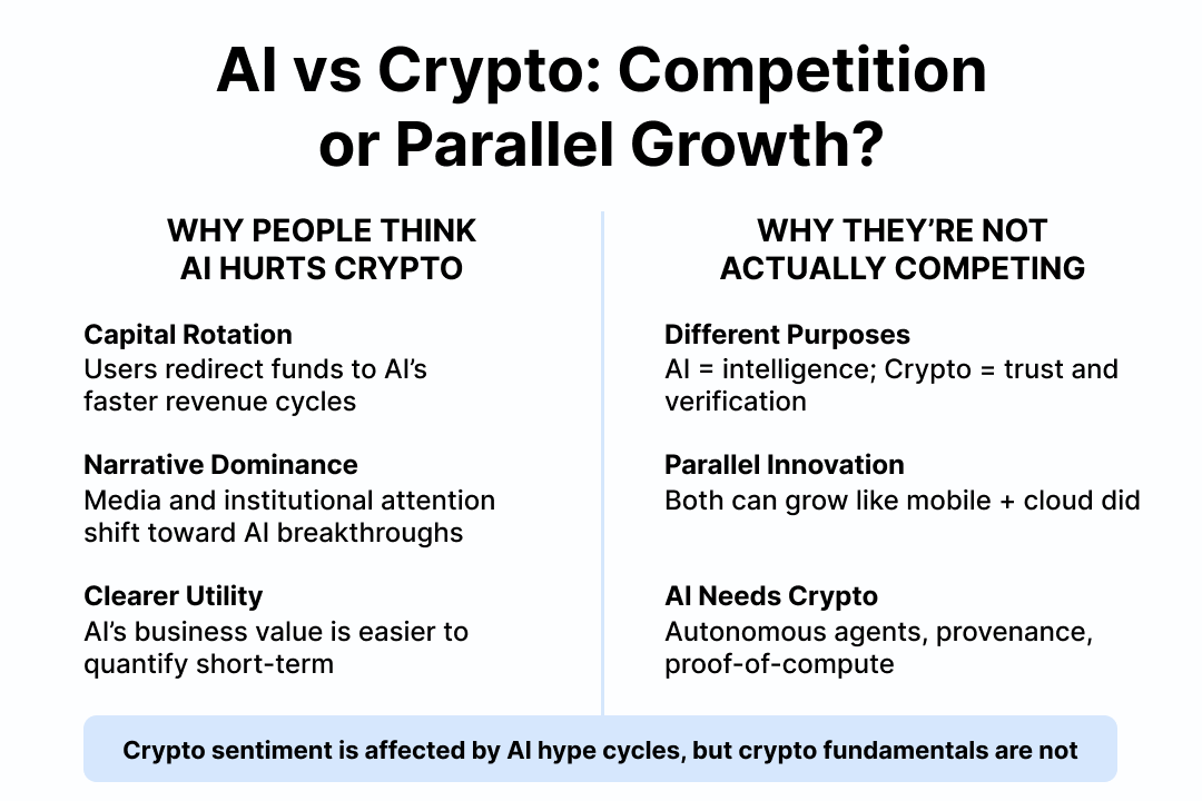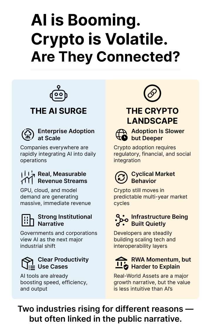 Artificial intelligence and crypto have become the twin lightning rods of modern technology—high-velocity, high-risk, and always at the center of market sentiment. When AI booms, some say users flee crypto; others claim AI interest fades when crypto rallies. Lately, a common explanation for crypto downturns has been: “The AI bubble drained the oxygen from the room.”